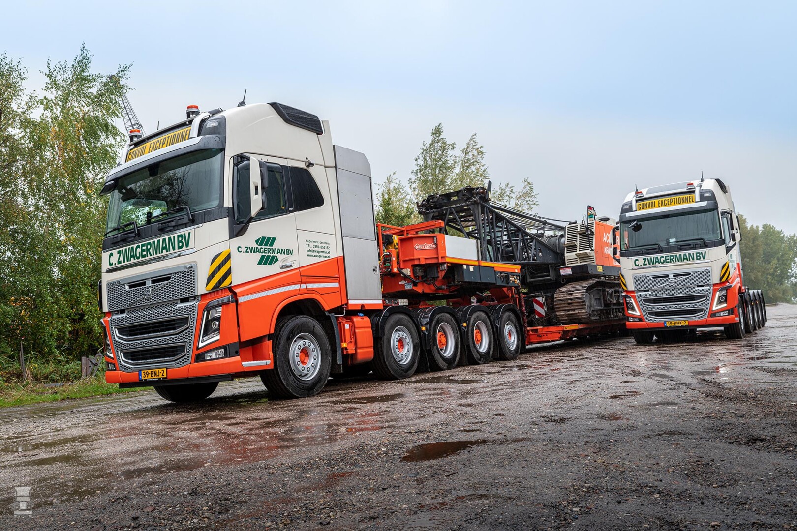 C. Zwagerman heeft twee fraaie nieuwe Volvo FH16 750 10x4 zwaar transport trekkers op de weg gezet. Het gaat daarbij om standaard 8x4 trekkers die bij Terberg Techniek een extra 9 tons voorloopas as kregen.
