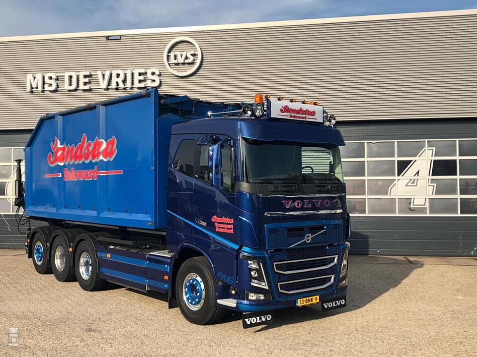 Sandstra transport uit Bolsward heeft een nieuwe Volvo FH16 650 8x4 tridem in gebruik genomen. Deze krachtpatser is uitgevoerd met de FH cabine met het lage dak. Door de opvallende zonneklep en de 'Oldskool' opbouw met lichtbak en luchthoorns is het een bijzonder fraaie truck geworden.