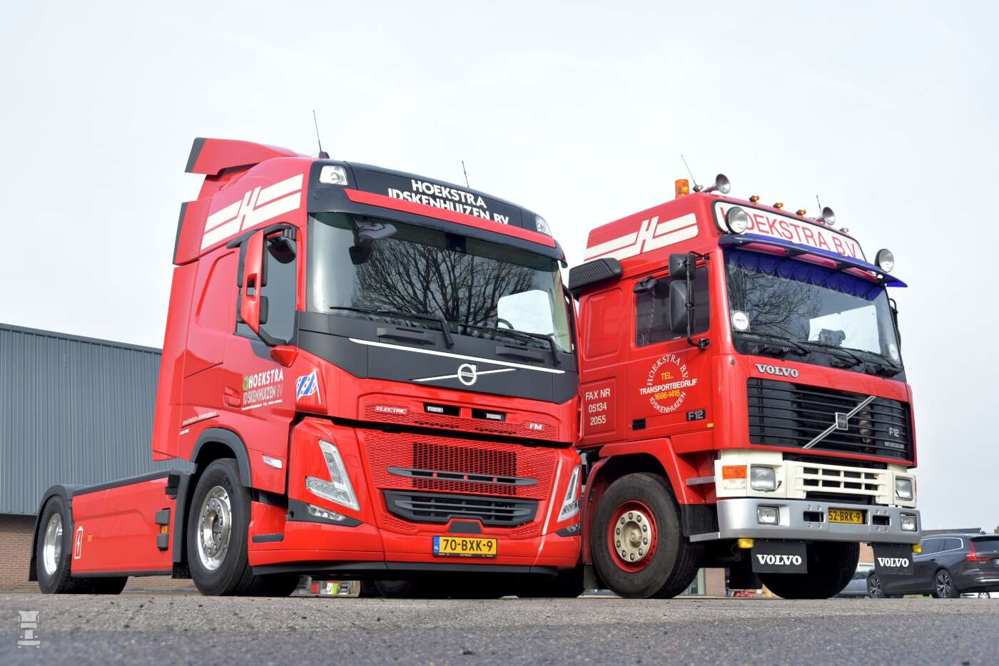 Voor de foto's kwam de oude Volvo F12 Globetrotter ook nog even uit de schuur om samen met zijn moderne, elektrische broertje op de foto te gaan.