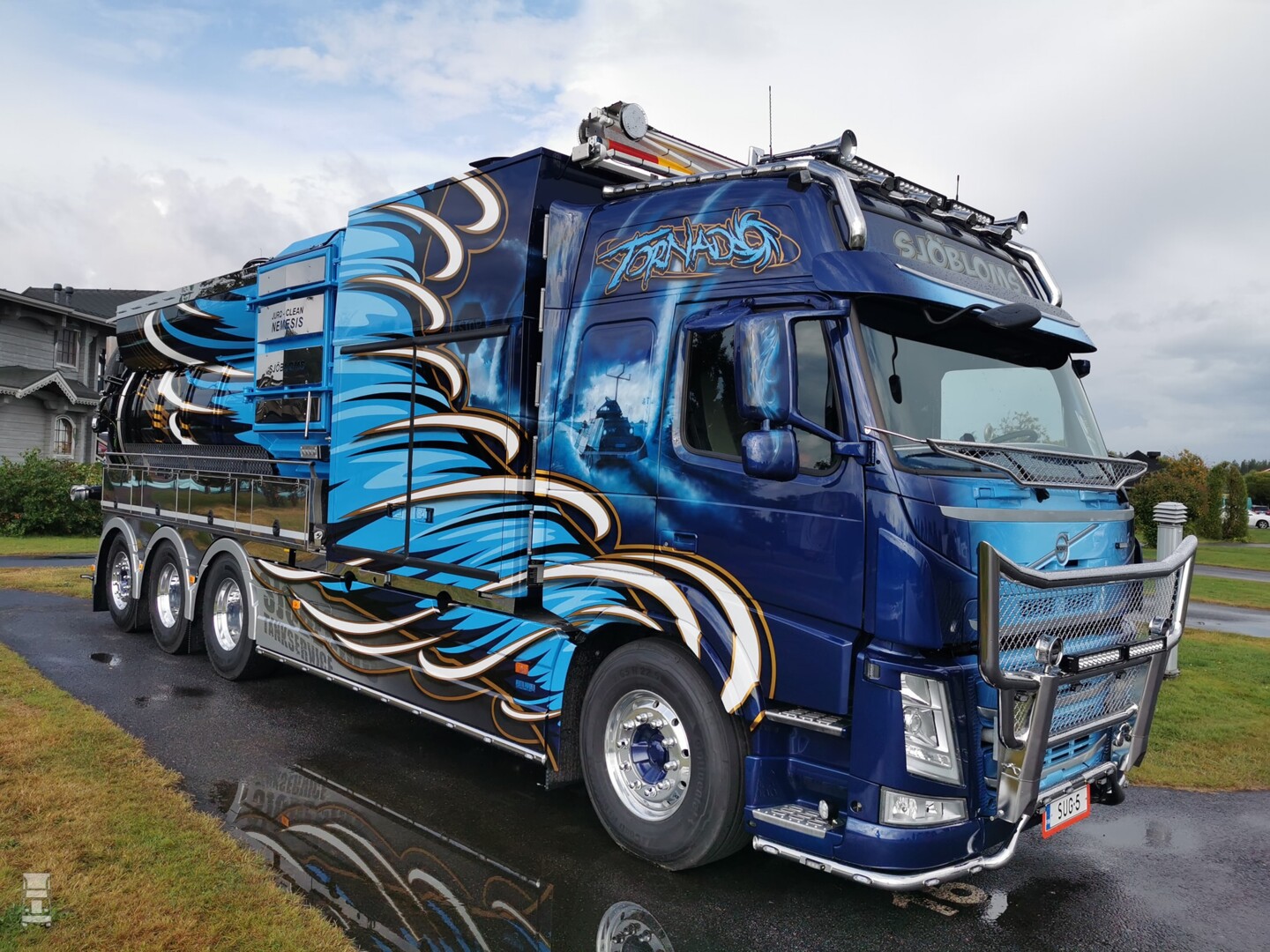 Een indrukwekkende Volvo FM, kan dat? Jazeker kan dat! Kijk maar eens naar deze stoere vierassige FM zuigwagen van Sjöblom's Tankservice uit het Finse Karjaa. De Volvo werd opgebouwd en gespoten door Ristimaa Customs en het special paint werk is van Terje Aspmo.