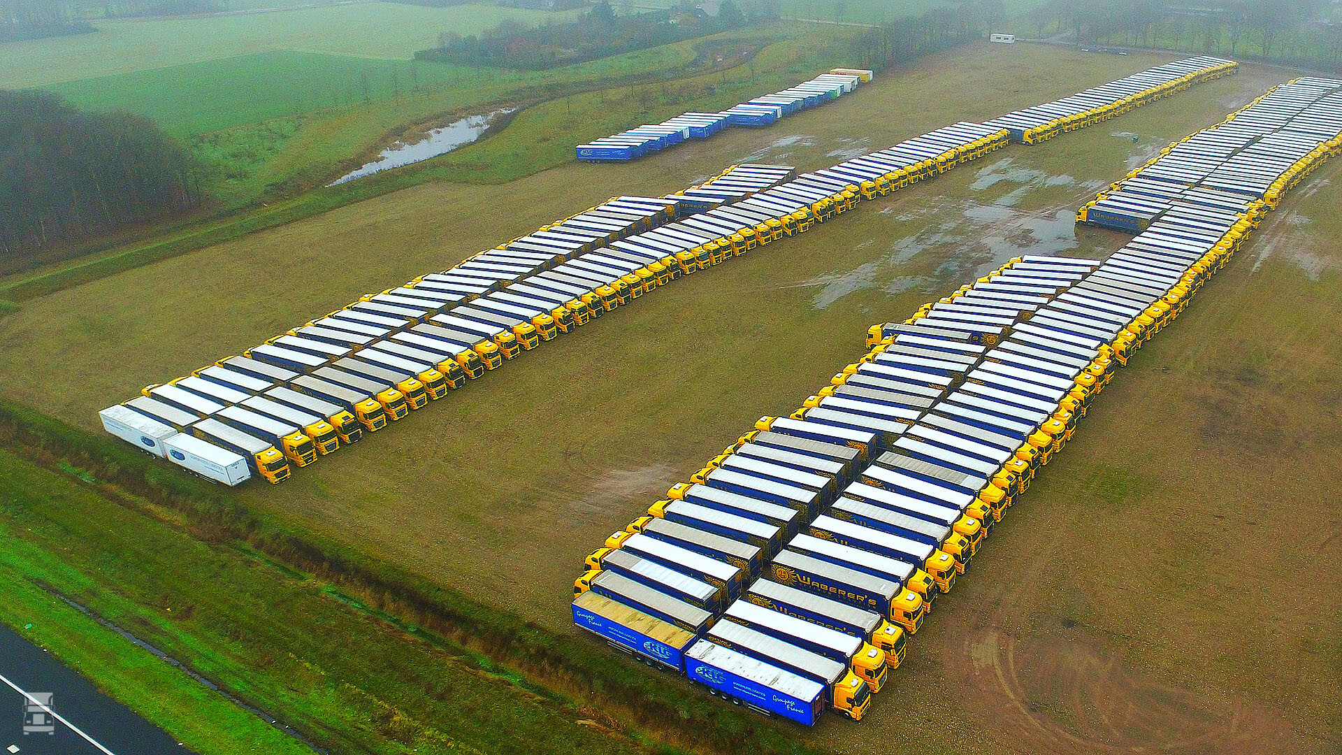 Deze ronduit scheefgegroeide situatie in Europa valt ieder jaar extra op tegen het einde van het jaar. Vervoerders zoeken dan een parkeerplaats waar de duizenden voertuigen veilig gestald kunnen worden. De chauffeurs worden dan met bussen naar huis gereden voor de feestdagen. Tot nu toe stonden de trucks vaak in België maar daar wordt aan alle kanten opgetreden tegen wantoestanden in het wegtransport. Vandaar dat Waberer’s deze keer koos voor het terrein bij Eersel. Hoe omstreden dit ook mag zijn, het is op zich legaal wat hier gebeurt maar het legt wel precies bloot wat sociale dumping losmaakt. Het blijft dan ook een omstreden fenomeen. Dat voelt KLG Europe, eigenaar van het terrein heel goed aan. Natuurlijk zijn er zakelijke belangen en zal Waberer’s wel een mooie rekening krijgen maar toch voelt het zelfs voor KLG Europa wat vreemd aan. Dat blijkt wel uit het feit dat dit bedrijf probeert om de gigantische rijen Waberer’s trucks aan het oog te onttrekken. Aan de zichtkanten van het terrein staan namelijk de eigen opleggers geparkeerd om de geel- blauwe combinaties met het zonnetje af te schermen. Met de drone van Rico Vogels van SQ Vision hadden ze echter geen rekening gehouden!