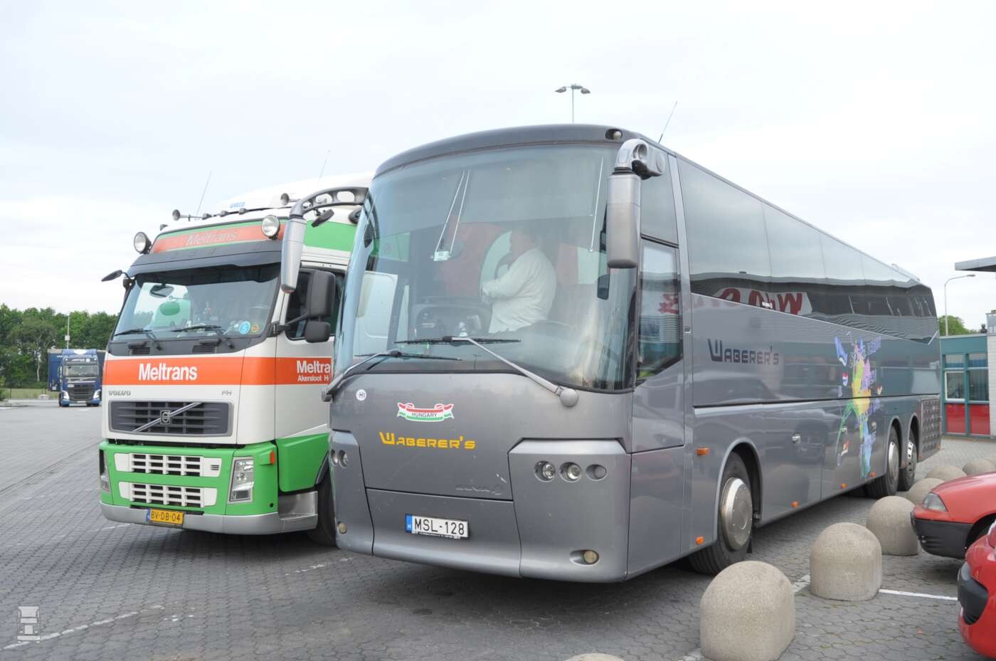 Nu de regelgeving omtrent het doorbrengen van de weekendrust in de cabine steeds strenger wordt in Europa krijgen we waarschijnlijk steeds meer van dit soort taferelen. Door de chauffeurs op te pikken en elders onder te brengen kan aan de wetgeving voldaan worden. Waar de chauffeurs worden ondergebracht is niet duidelijk, maar dat zal wel niet in het Hilton zijn waarschijnlijk.. Wordt vervolgd..