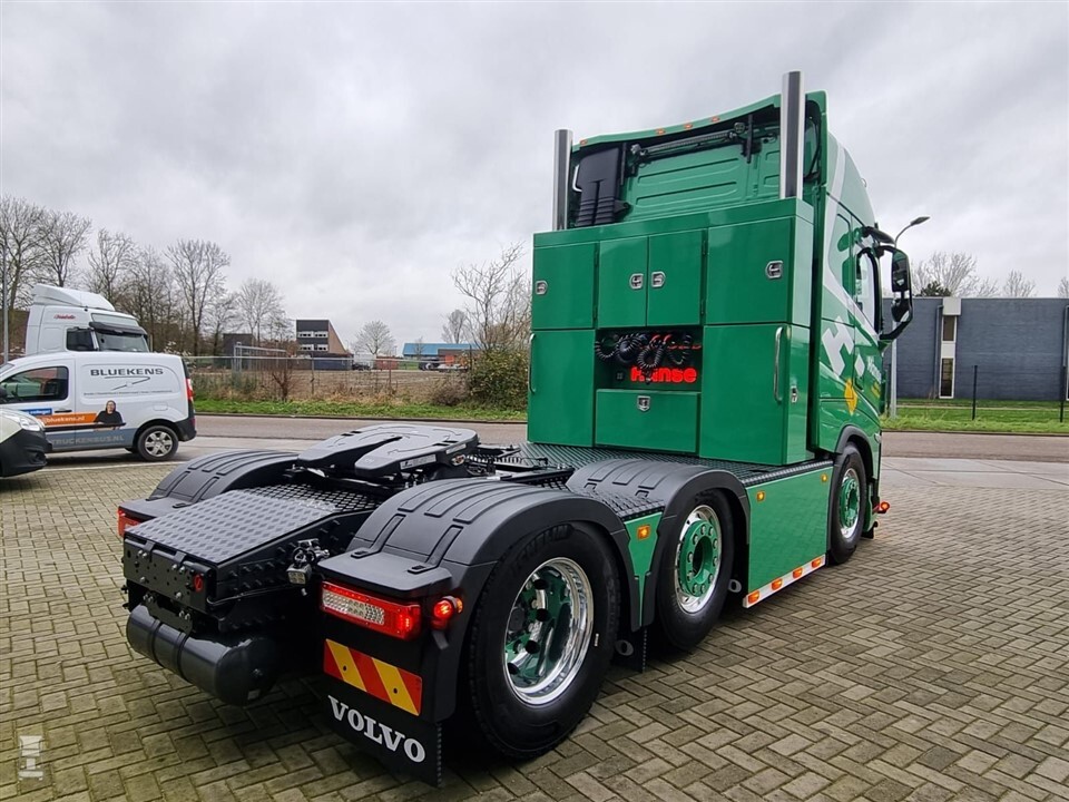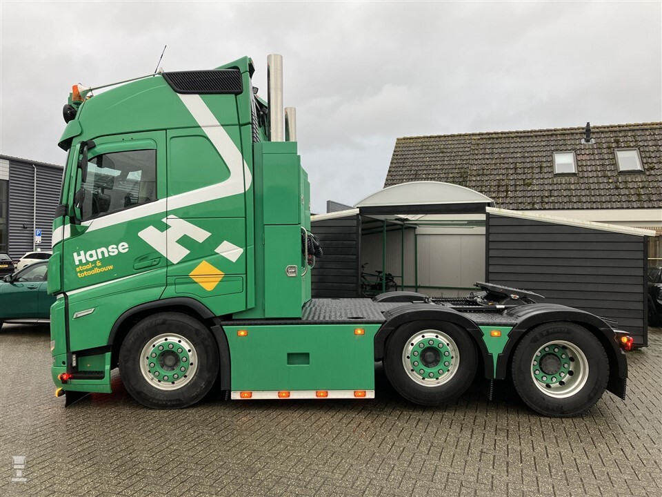 De Volvo ziet er strak uit in de bedrijfskleuren van Hanse. Talloze accessoires sieren de nieuwe trekker, van vele lampjes tot een flinke lichtbak. Deze zijn allemaal gemonteerd door dealer Bluekens Truck & Bus in Middelharnis. Achter de cabine kwam een fraaie kastenwant, die samen met de vlonders is opgebouwd door José de Visser. Hierbij vallen de staande uitlaten op, die door de kastenwand heen lopen. Bij Spuiterij De Muijnck in Borssele is de Volvo gespoten.