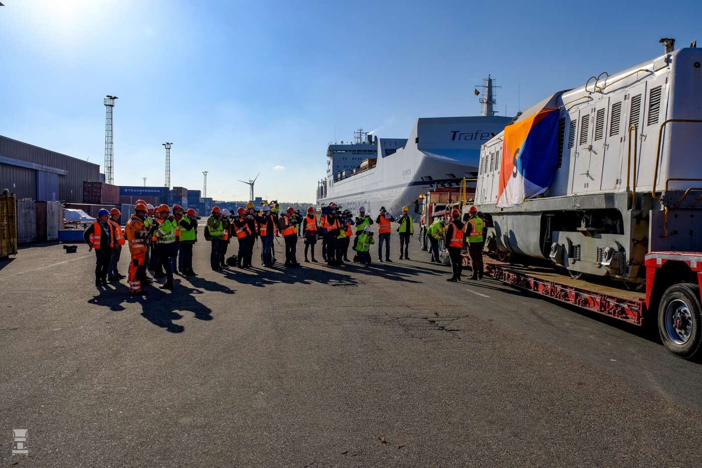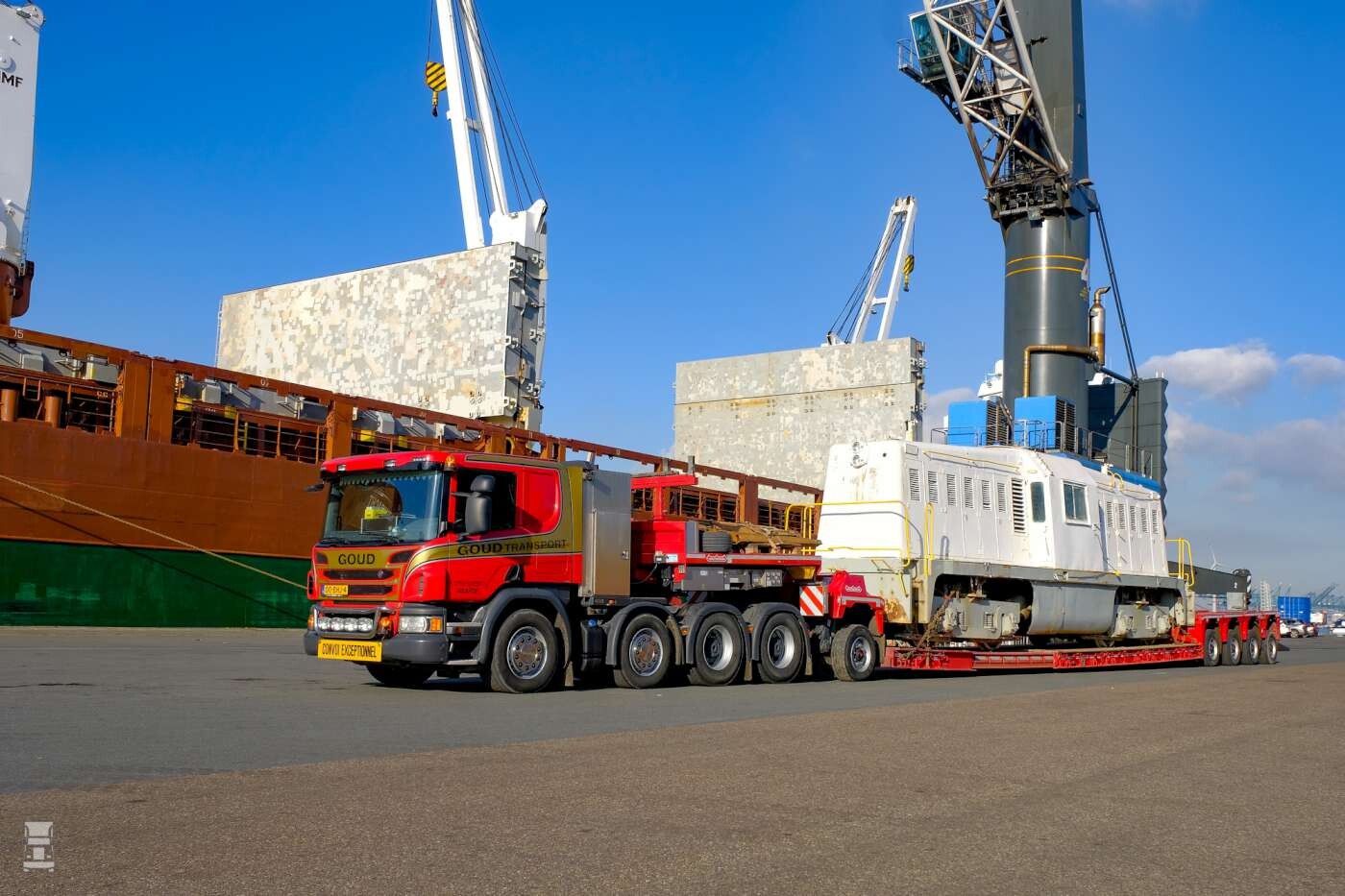 Goud Transport B.V uit Waarde zette voor dit klusje hun specialist Hans Hoogesteger in. Met zijn 4-assige Scania P450 trekker en 4-assige Nooteboom Eurodieplader met een enkelas Interdolly leverde Hans de ruim 65 ton zware locomotief probleemloos af in Goes. Door de geïntegreerde spoorrails in de dieplader vloer en de in eigen beheer ontworpen railsoprit, was er geen zware kraan nodig om de locomotief in Goes te lossen. Dit scheelde aanzienlijk in de kosten van de hele transport operatie.