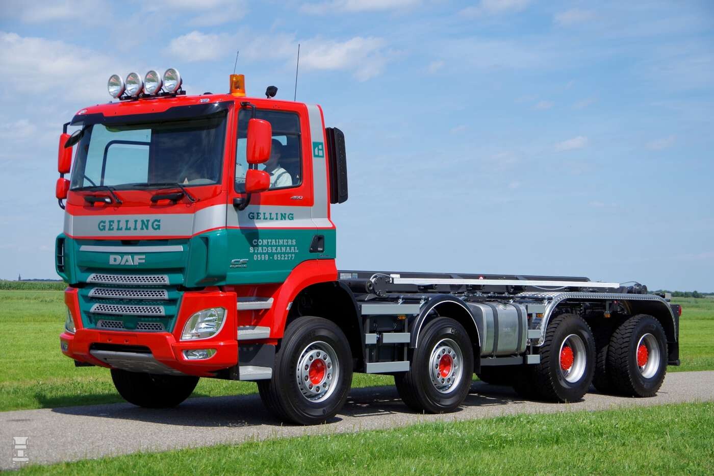 Gelling Containers B.V. uit het Groningse Stadskanaal is actief in het transport van afzetcontainers en in de handel in steen- en bestratingsmaterialen. Speciaal voor het vervoer van stenen zocht het bedrijf een vrachtwagen met een zo hoog mogelijk laadvermogen, maar ook met een grote wendbaarheid. Een andere eis van Gelling was een hoge mate van betrouwbaarheid. De standaard DAF 8x4 FAD werd door Veldhuizen Wagenbouw voorzien van een mechanisch geveerd- en gestuurd wide-spread systeem waardoor er extra laadvermogen ontstond. Bovendien zorgt de gestuurde as voor minder wrijving. Daarmee worden zowel de ondergrond als de banden gespaard.