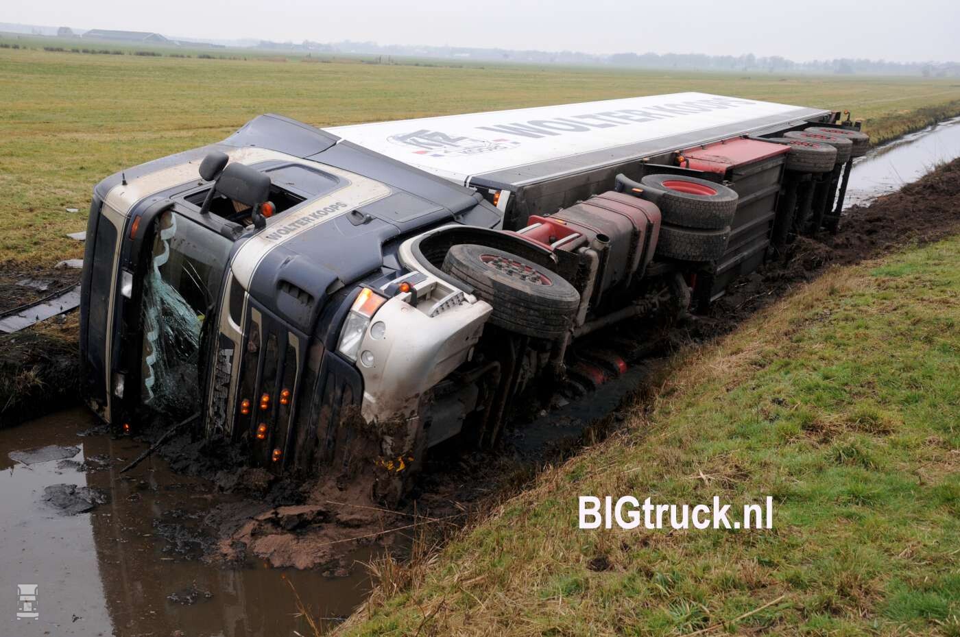 De geladen vrachtwagencombinatie raakte naast de weg en in de zompige berm was de chauffeur daarna kansloos. Het hele span maakte een relatief zachte landing in de brede sloot. De chauffeur hield er dan ook niets aan over. Bergingsbedrijf Wielsma was snel ter plaatse maar kon niet veel uitrichten. Eerst was het wachten op extra handkracht om de lading kazen over te laden in een andere trailer.