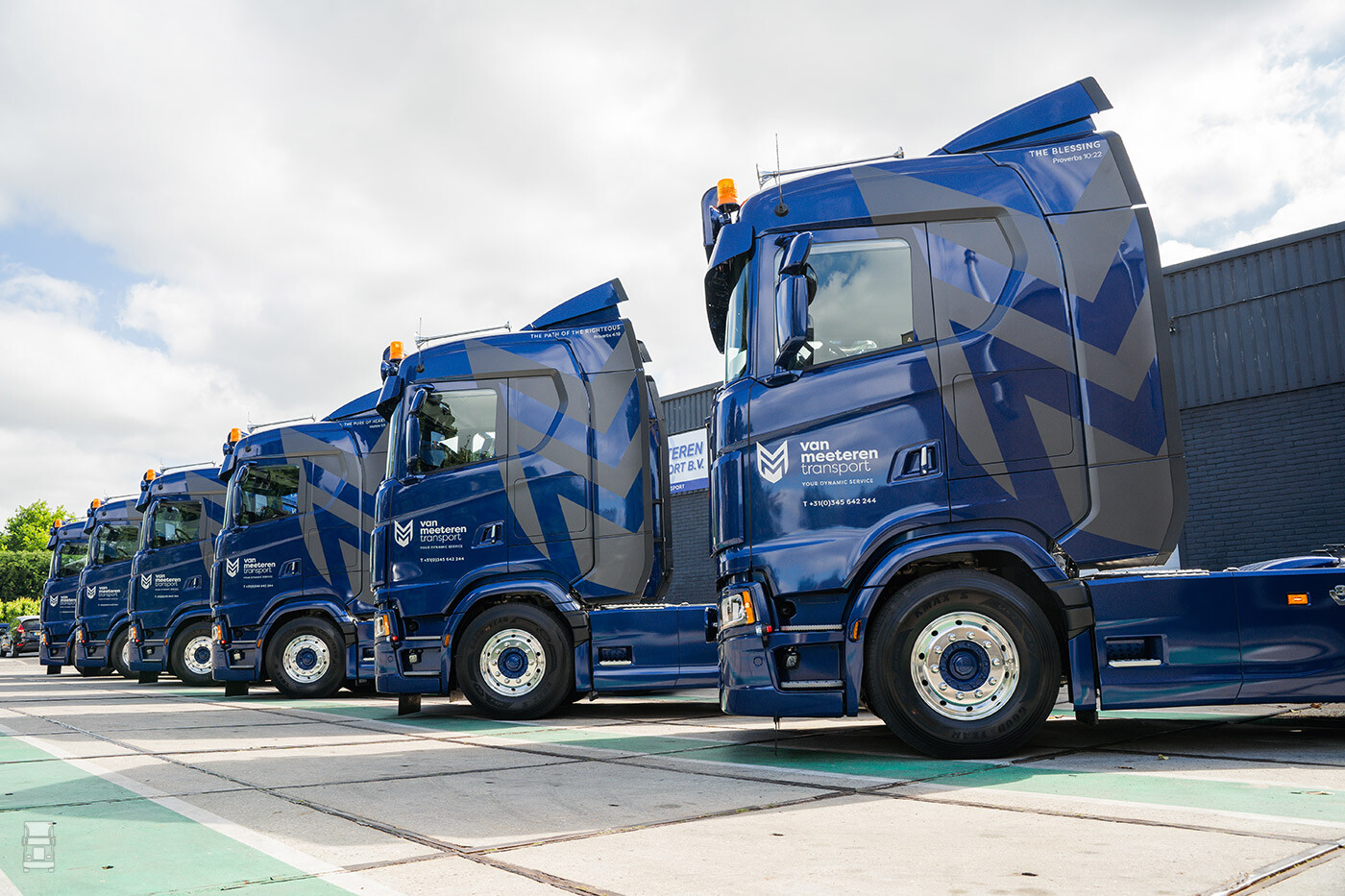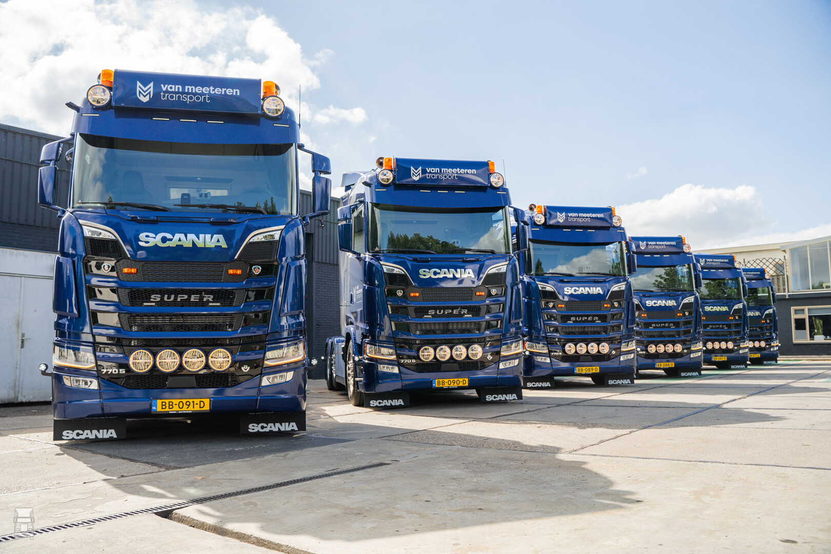 Van Meeteren bestelde 5 van de 6 trekkers in een 6x2/4 combinatie met een gestuurde voorloopas, de zesde trekker komt als 6x4 met een uitschakelbare tandemas en (als enige) een verstelbare schuifschotel. Alle trekkers zijn gekeurd als zwaar transportvoertuig op tenminste 72 ton, waarbij de 6x4 iets verder gaat, namelijk 90 ton. Allemaal voorzien van een clutch on demand om optimaal te kunnen manoeuvreren. Het Scania EAS zorgt dankzij de elektro hydraulische stuurinrichting voor een grotere stuurprecisie, betere koersvastheid en meer comfort bij lage snelheden. Opties als Alcoa Durabright velgen en een ruime bezetting extra lampen maken het beeld van buitenaf helemaal compleet.