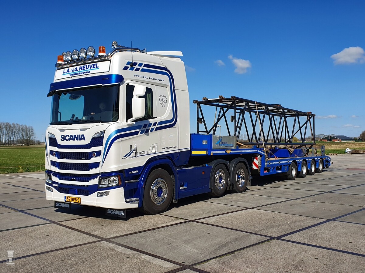 Speciaal transportbedrijf Van den Heuvel uit Werkendam had al een paar jaar geen Scania’s meer gekocht. ´Maar als wij iets doen, doen we het goed. Dus gingen we deze keer voor een dikke R500 6x2 met voorloopas en een nóg dikkere S650 V8 in een 6x4 variant met naafreductie” aldus Bas van den Heuvel.