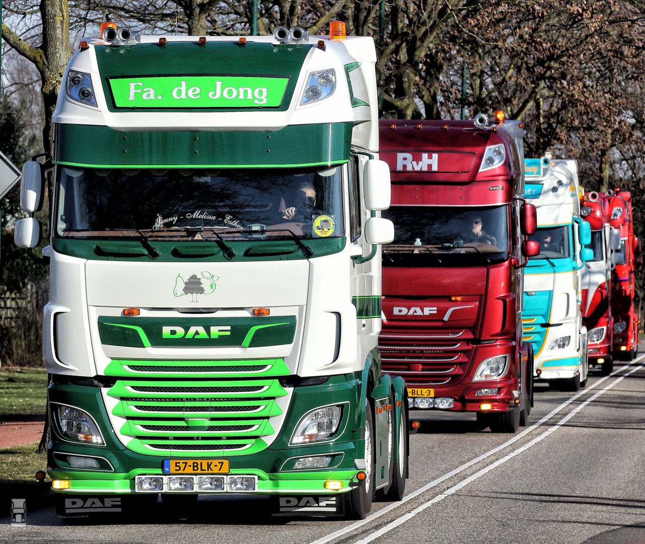 Die stoet die kwam er, maar dan mocht Harm in één van de DAF trucks plaats nemen naast de chauffeur met een prima uitzicht op de begeleidende voertuigen, inderdaad allemaal DAF’s op onze konvooi leider na.