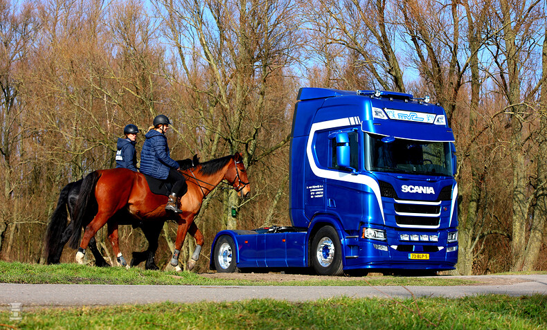 Dat viel samen met een ‘nieuwe’ Scania, deze R450 is jong gebruikt gekocht en in de huisstijl gespoten die sinds een aantal jaren is ingevoerd. Van Rijswijk houd zich bezig met het vervoer van pallets,oude metalen en potgrond. Om deze reden is de Scania R450 uitgevoerd met een hulpas die onopvallend is weggewerkt achter de side skirts. Verder staat de Scania op Alcoa wielen om het eigen gewicht omlaag te brengen. Bart heeft ook nog een onderlip onder de bumper laten monteren zodat de Scania lekker smoelt. Bart zegt: “Aan het begin moest ik erg wennen aan het nieuwe model maar zoals die nu in onze kleuren staat ben ik er erg blij mee en vind ik het een hele mooie auto geworden”.